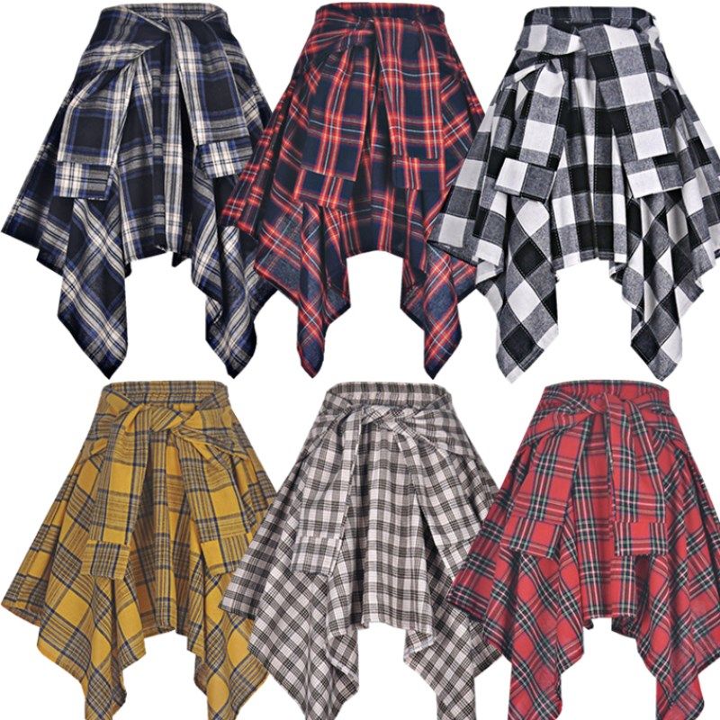 松紧腰格子不规则四角半身裙中短裙子系带绑带蝴设计师款原创定制热门设计联盟服务商