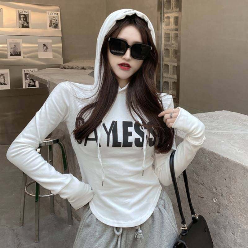 2021新款早秋纯棉白色卫衣连帽长袖修身打底衫字母设计感上衣女装热门设计联盟服务商